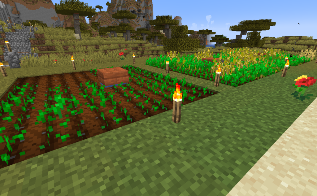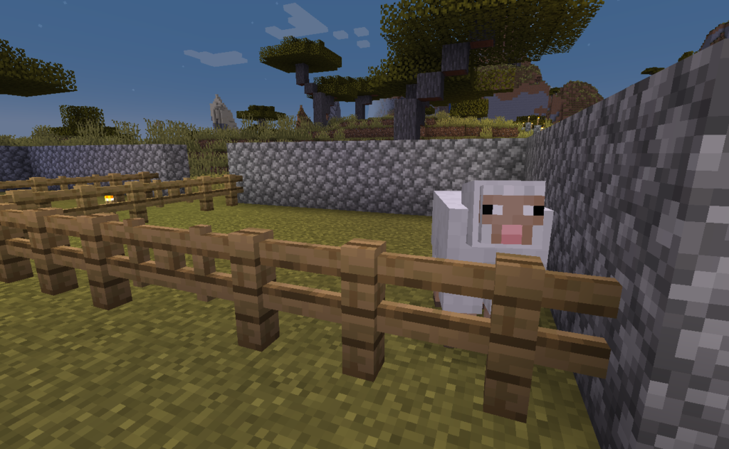 〖始まりの祠〗はサバンナバイオームなのですが全然牛や羊がわかないんですよね~、(´;ω;`)仕方なく離れた場所から調達です。